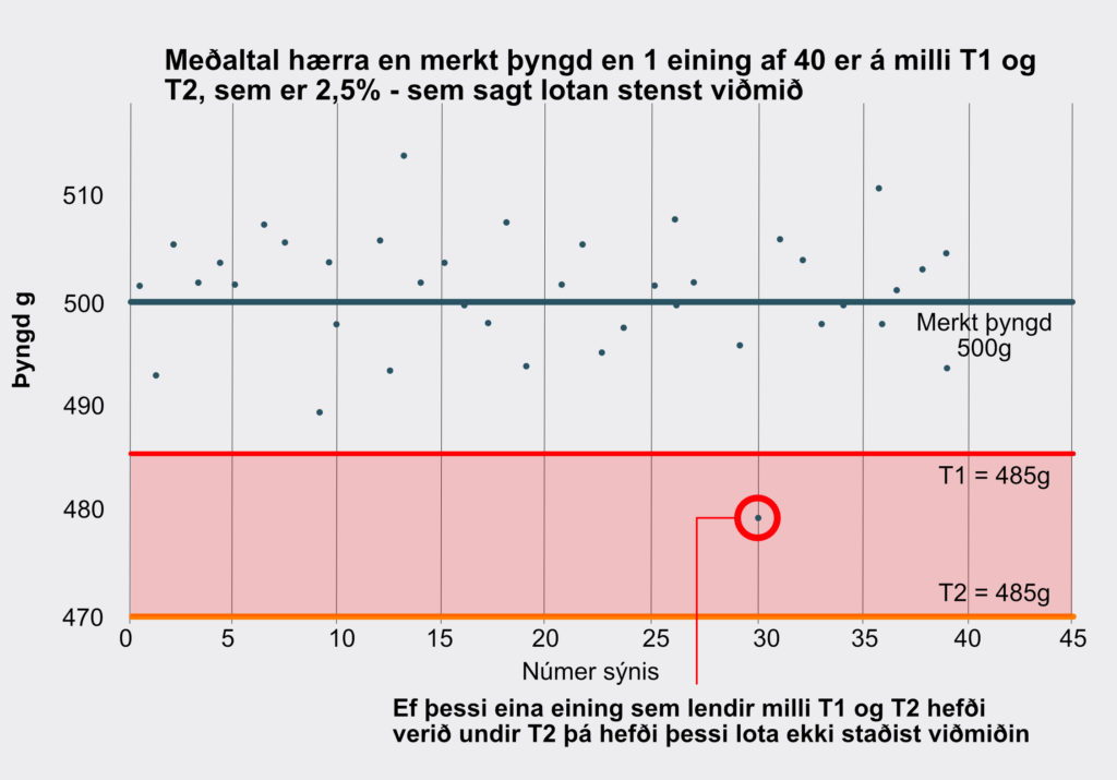 - Regla 2: Allt að 2,5% (1 af 40) eininga mega vera léttari en merkt þyngd að frádregnu leyfðu neikvæðu fráviki, T1 sbr. töflu hér fyrir neðan.