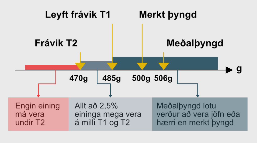 Myndin hér fyrir ofan sýnir dæmi um 500g pakkningu og þau viðmið sem eru í gangi. Meðalþyngdin er 506g í þessu dæmi en hún gæti þurft að vera hærri eða mögulega lægri allt eftir því hversu gæði vigtunar er mikil.