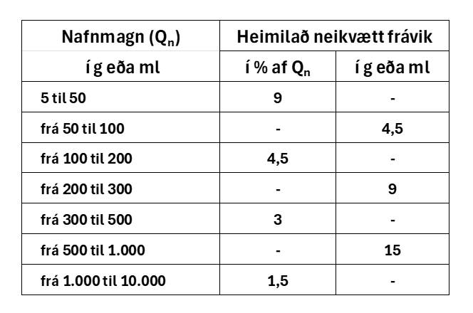 Leyfð frávik eða „heimilað neikvætt frávik“ (T1) má sjá í töflunni hér að neðan, en frávikin eru háð þyngd pakkninga.